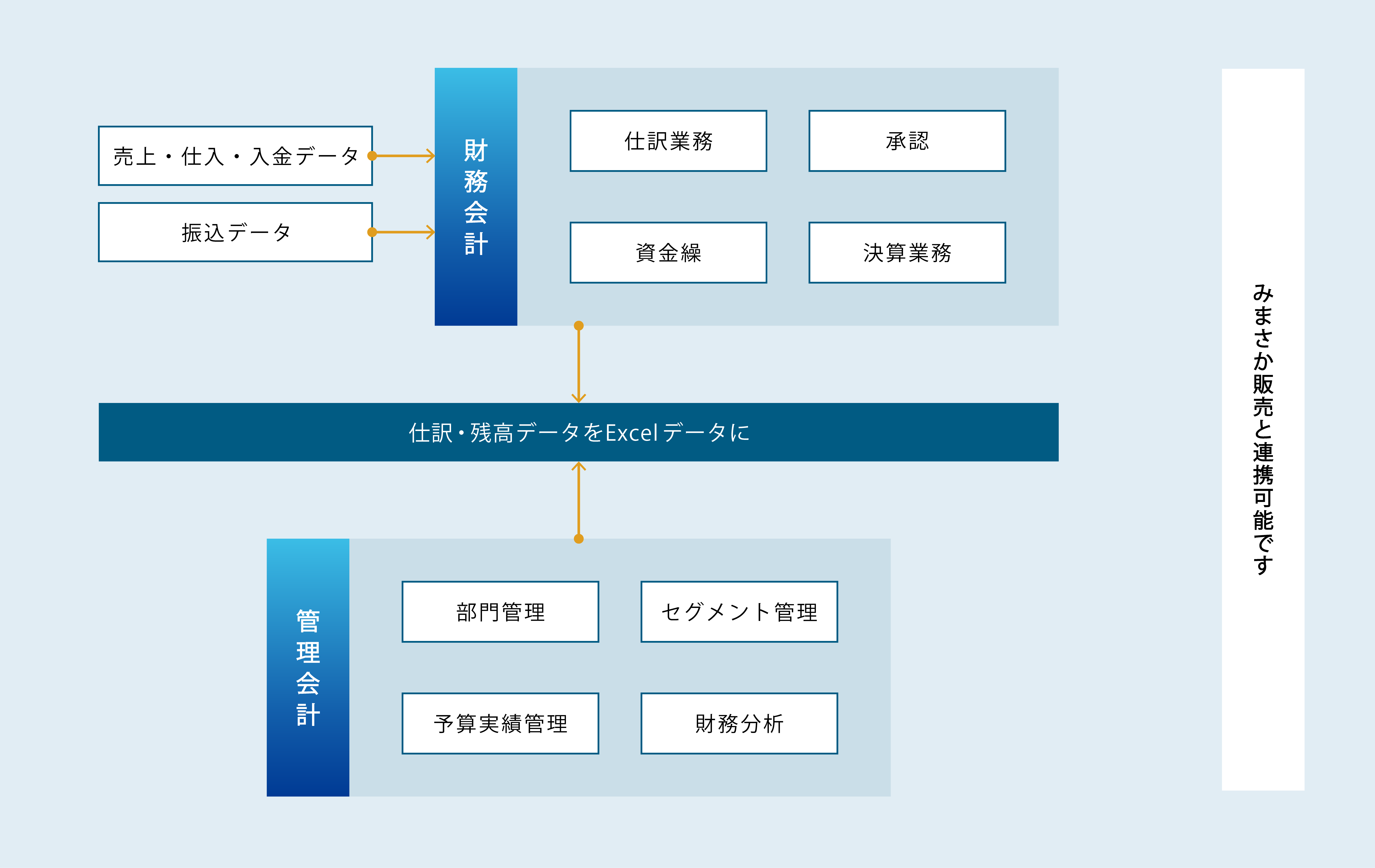 みまさか会計は基幹業務アプリケーションとしてデータ連携の柔軟性に優れ、仕訳に必要な情報の一元化を実現し、経理業務の省力化・効率化を図ります。 さらに多角的な管理システムによる業務分析は、経営者の意思決定を強力にサポートします。